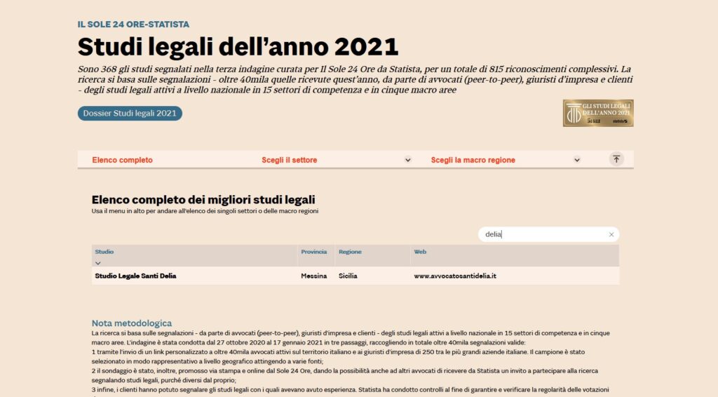L’indagine, denominata “Studi Legali dell’anno 2021” e condotta da Statista, la società che gestisce uno dei principali portali di statistica e business intelligence al mondo. La classifica è stata creata a seguito di una complessa procedura ed analisi, e gli elenchi elaborati sulla base delle segnalazioni inviate al Sole 24 ore.